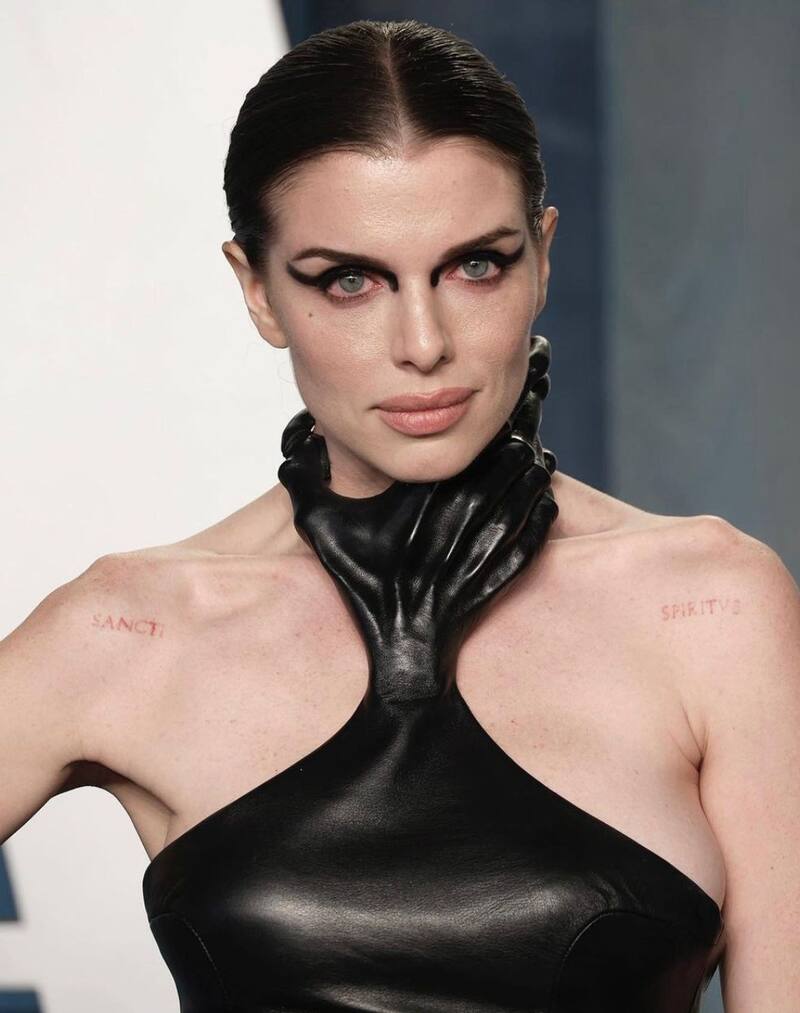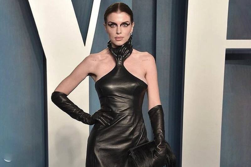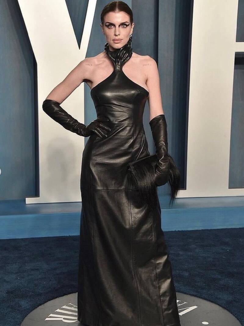 Julia Fox comenzó una verdadera conversación sobre moda durante su paso por la red carpet de la fiesta de los Oscar de Vanity Fair, en donde apareció con un vestido de piel negro diseñado por Han Kjovenhavn.