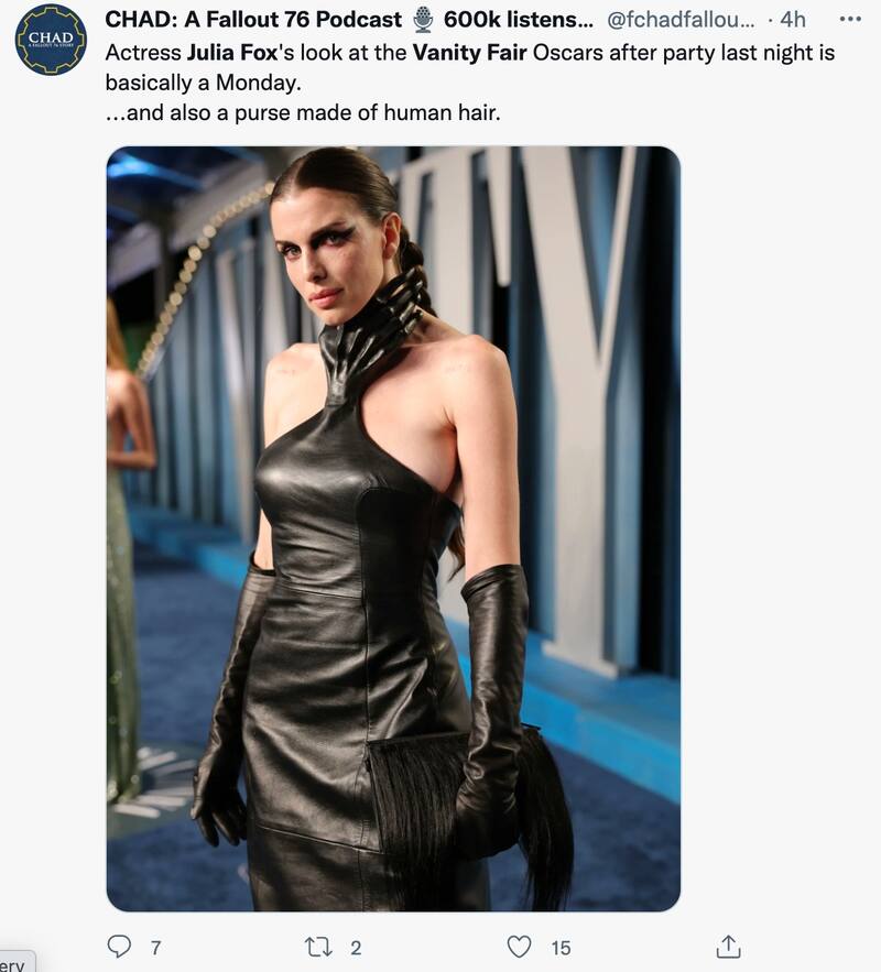 "El look de Julia Fox para la fiesta de Vanity Fair representa nuestro lunes... con una bolsa de cabello humano".