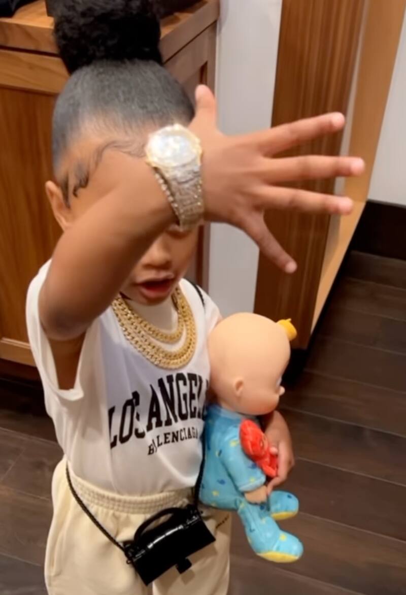 Esto no incluye sus cadenas de oro, que en otras fotos se ha visto que están decoradas con diamantes, al igual que sus enormes aretes. Además, aparece luciendo el reloj Patek Philippe que su mamá le regaló en su cumpleaños #2.
