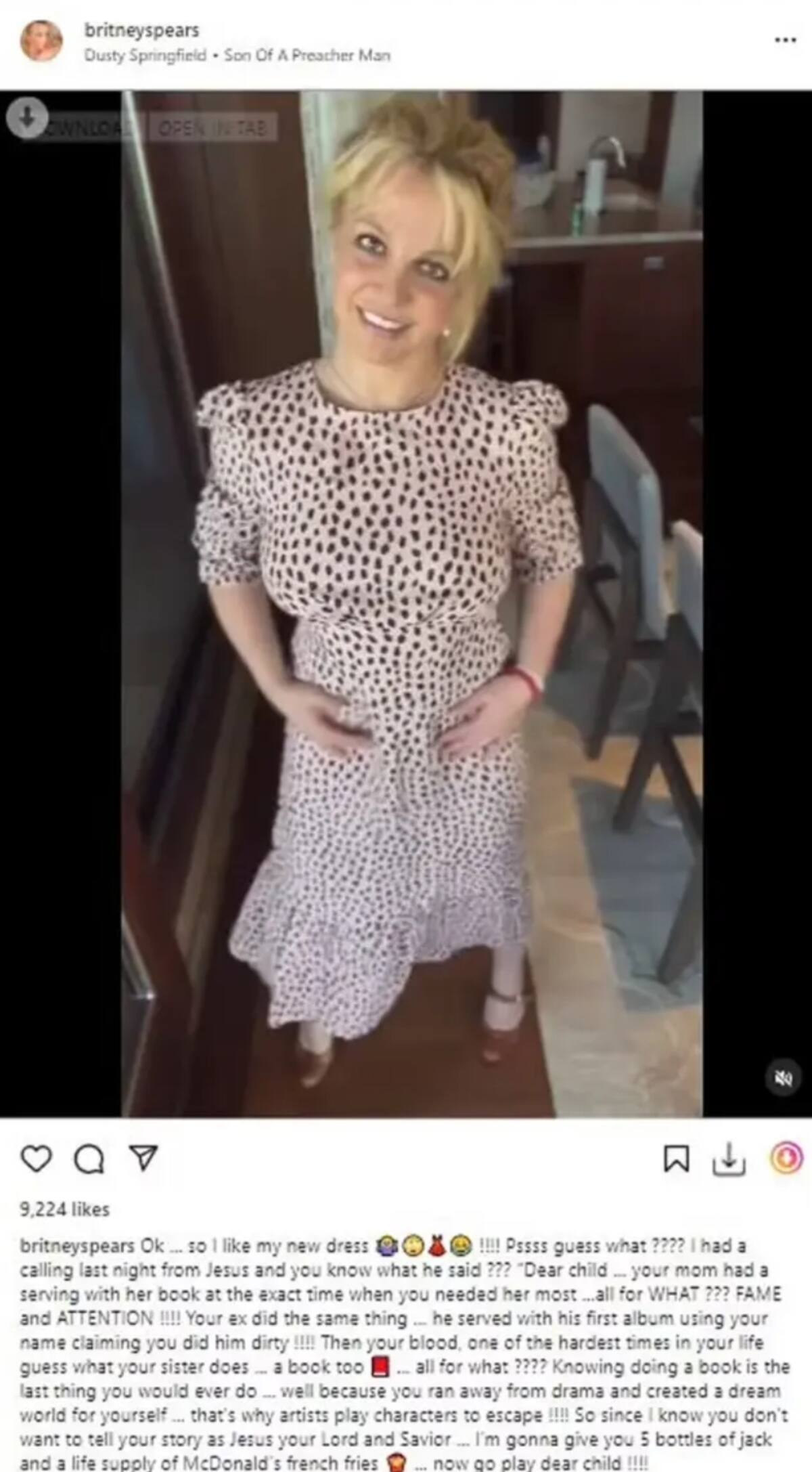 “Me gusta mi nuevo vestido”, comenzó. “Adivinen qué. Tuve una llamada la noche de ayer de Jesucristo, y ¿saben qué me dijo? ‘Querida hija tu mamá te usó con su libro en el momento que más la necesitabas… ¿Todo para qué? Fama y atención. Tu ex novio hizo exactamente lo mismo, vendió su primer álbum asegurando que le fuiste infiel…’”.