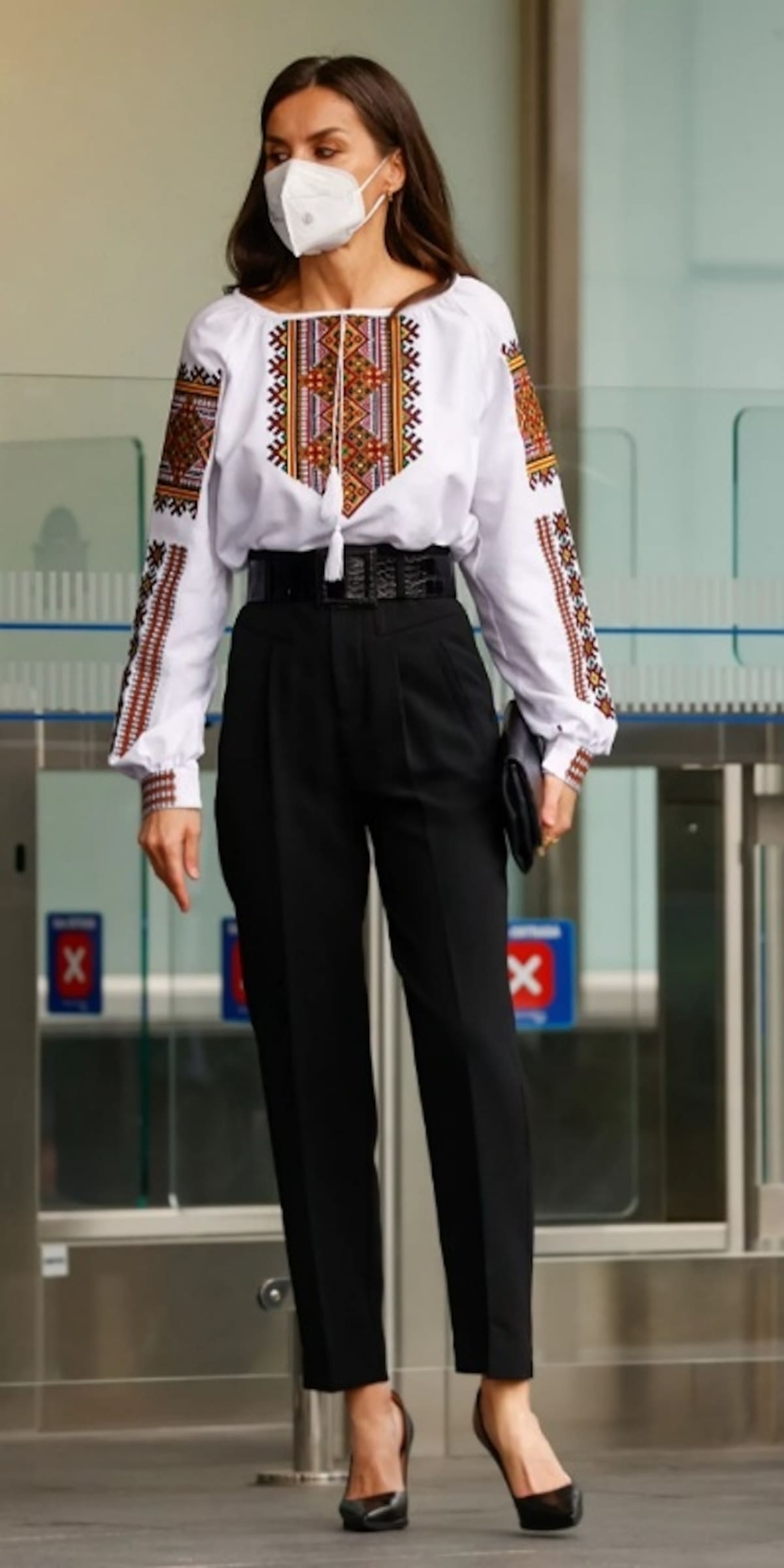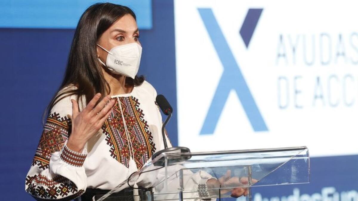La reina llevaba un traje de sastre negro, pero al entrar en el edificio dejó al descubierto una blusa muy significativa, que, según la revista “¡Hola!” fue bordada por mujeres ucranianas que viven en España.