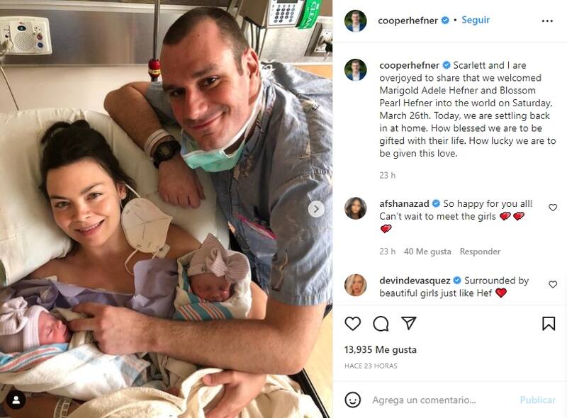 A través de su cuenta de Instagram, Hefner compartió una postal en la que aparecen ambos en el hospital, dándole la bienvenida a Marigold Adele y Blossom Pearl, las dos niñas que vienen a iluminar sus vidas.