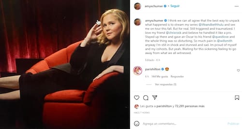 Amy Schumer publicó en su Instagram su opinión, expresando lo conmocionada que estaba por lo sucedido. "Creo que todos estamos de acuerdo en que la mejor manera de desentrañar lo sucedido es transmitir mi serie @lifeandbethhulu y verme de gira este otoño", empezó escribiendo.