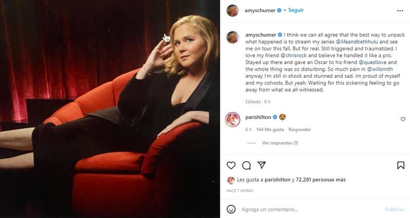 Amy Schumer publicó en su Instagram su opinión, expresando lo conmocionada que estaba por lo sucedido. "Creo que todos estamos de acuerdo en que la mejor manera de desentrañar lo sucedido es transmitir mi serie @lifeandbethhulu y verme de gira este otoño", empezó escribiendo.