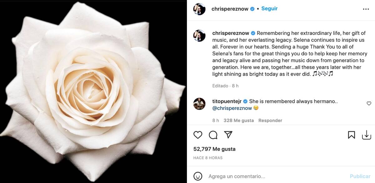 Para acompañar la imagen en cuestión, el músico escribió: "Recordando su vida extraordinaria, su don de la música y su legado eterno. Selena continúa inspirándonos a todos".