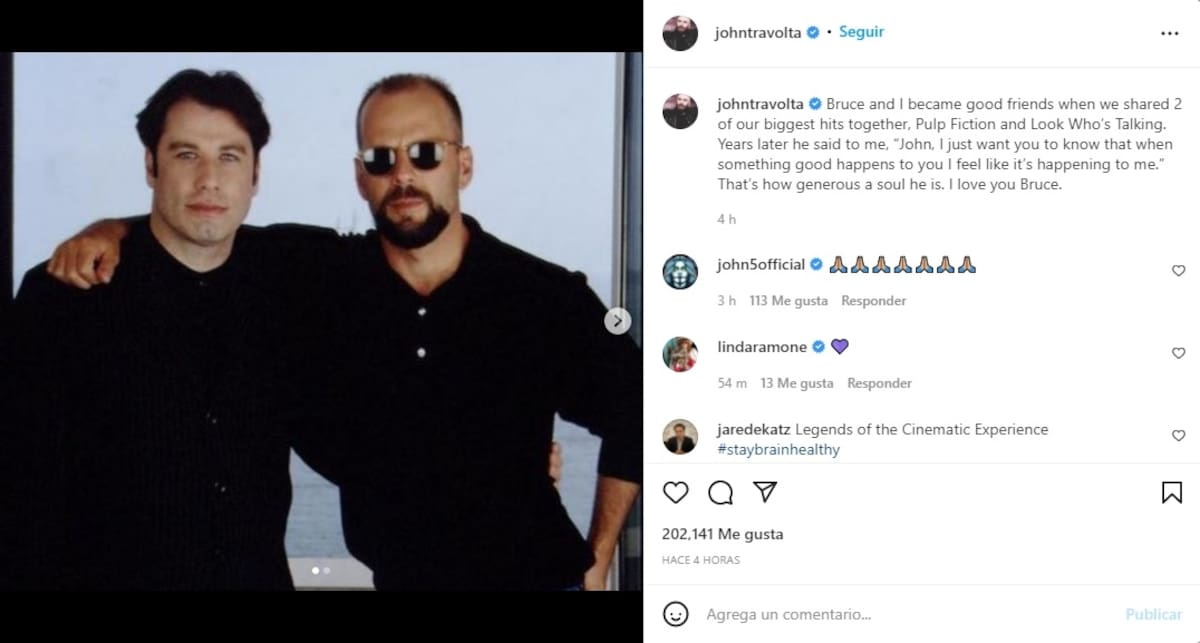 Travolta compartió a través de su Instagram unas emotivas palabras que le dedicó a su colega tras la noticia de su retiro: "Bruce y yo nos hicimos buenos amigos cuando compartimos 2 de nuestros mayores éxitos juntos, 'Pulp Fiction' y 'Mira quién habla'", escribió.