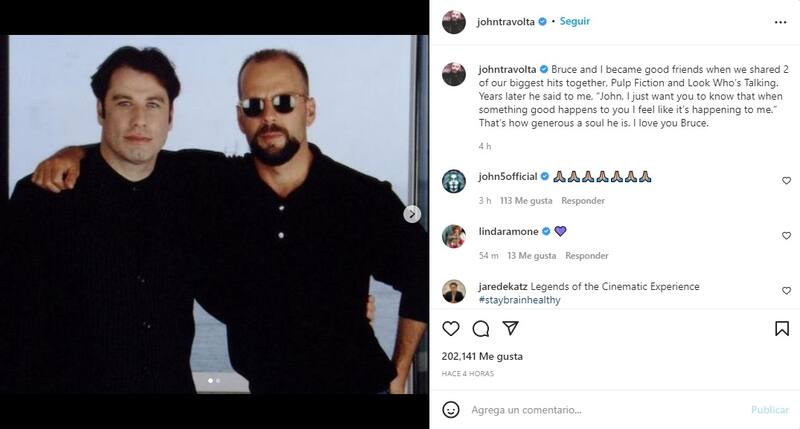 Travolta compartió a través de su Instagram unas emotivas palabras que le dedicó a su colega tras la noticia de su retiro: "Bruce y yo nos hicimos buenos amigos cuando compartimos 2 de nuestros mayores éxitos juntos, 'Pulp Fiction' y 'Mira quién habla'", escribió.