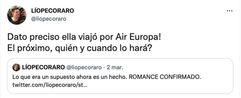 Mientras que un día después, citó aquel tweet con: "Lo que era un supuesto ahora es un hecho. ROMANCE CONFIRMADO", para posteriormente completar con: "Dato preciso ella viajó por Air Europa! El próximo, quién y cuándo lo hará?".