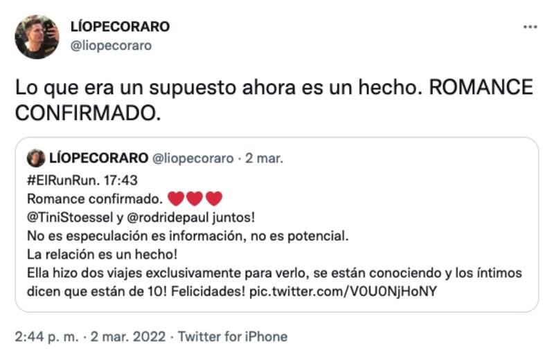 Después de que el 2 de marzo escribiera: "Romance confirmado. @TiniStoessel y @rodridepaul juntos! No es especulación es información, no es potencial. La relación es un hecho! Ella hizo dos viajes exclusivamente para verlo, se están conociendo y los íntimos dicen que están de 10! Felicidades!".