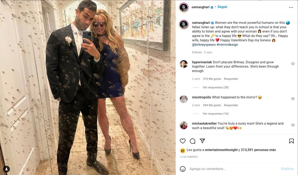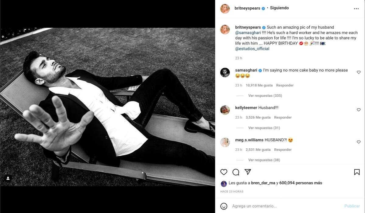 Lo mismo ocurrió con una publicación en la que Britney acompañó con el texto: "Una foto tan increíble de mi marido @samasghari!!!! ¡Es tan trabajador y me sorprende cada día con su pasión por la vida! Soy tan afortunada de poder compartir mi vida con él…. feliz cumple".