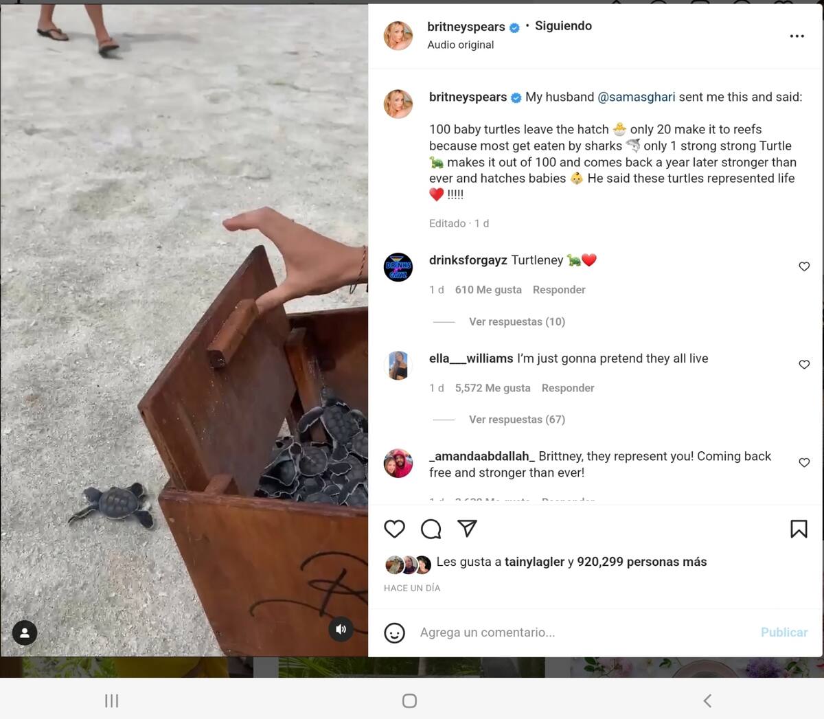 Pero unas horas despué, compartió con sus seguidores un vídeo en el que liberan unas tortugas, pero en esta ocasión dejó de referirse a Sam Asghari como su prometido: "Mi marido Sam me mandó esto y me dijo: '100 tortugas bebés salen de la escotilla. Solo 20 llegan al arrecife porque el resto son devoradas por tiburones".