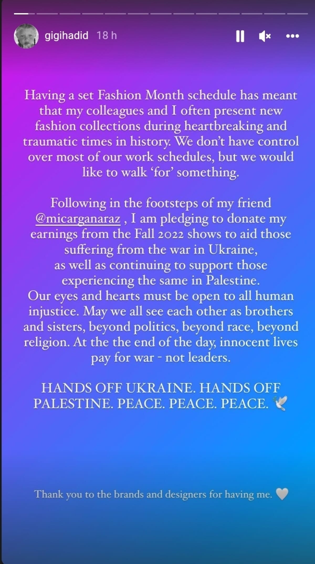 Gigi Hadid añadió: "Siguiendo los pasos de mi amiga @micarganaraz, me comprometo a donar mis ganancias de los desfiles de la colección Otoño de 2022 para ayudar a quienes sufren la guerra en Ucrania, además de continuar apoyando a quienes experimentan lo mismo en Palestina. Nuestros ojos y corazones deben estar abiertos a toda injusticia humana".