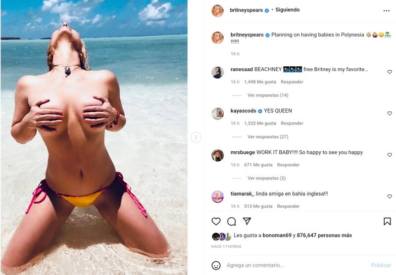 La "Princesa del Pop" compartió más fotos en topless de sus recientes vacaciones, y ¡un plan para tener "bebés"! "Planeando tener bebés en Polinesia!!!!!!", publico la cantante en un "post" al que acompañan una foto de la cantante tomando el Sol en una maravillosa playa de arena blanca y agua cristalina.