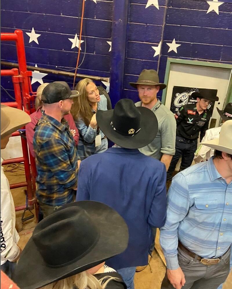 El exjinete de toros Cory Melton, también compartió, pero luego eliminó, la imagen y escribió: "El príncipe Harry pasando el rato en el rodeo esta semana... Recibimos mucha realeza del rodeo, pero este es el primer príncipe que He visto. Dijo que iba a entrar en la monta de toros, pero la aerolínea perdió su bolsa de aparejamiento…"
