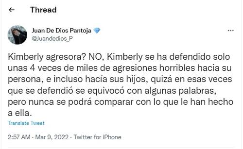 "Kimberly agresora? NO, Kimberly se ha defendido solo unas 4 veces de miles de agresiones horribles hacia su persona, e incluso hacía sus hijos, quizá en esas veces que se defendió se equivocó con algunas palabras, pero nunca se podrá comparar con lo que le han hecho a ella", sentenció.