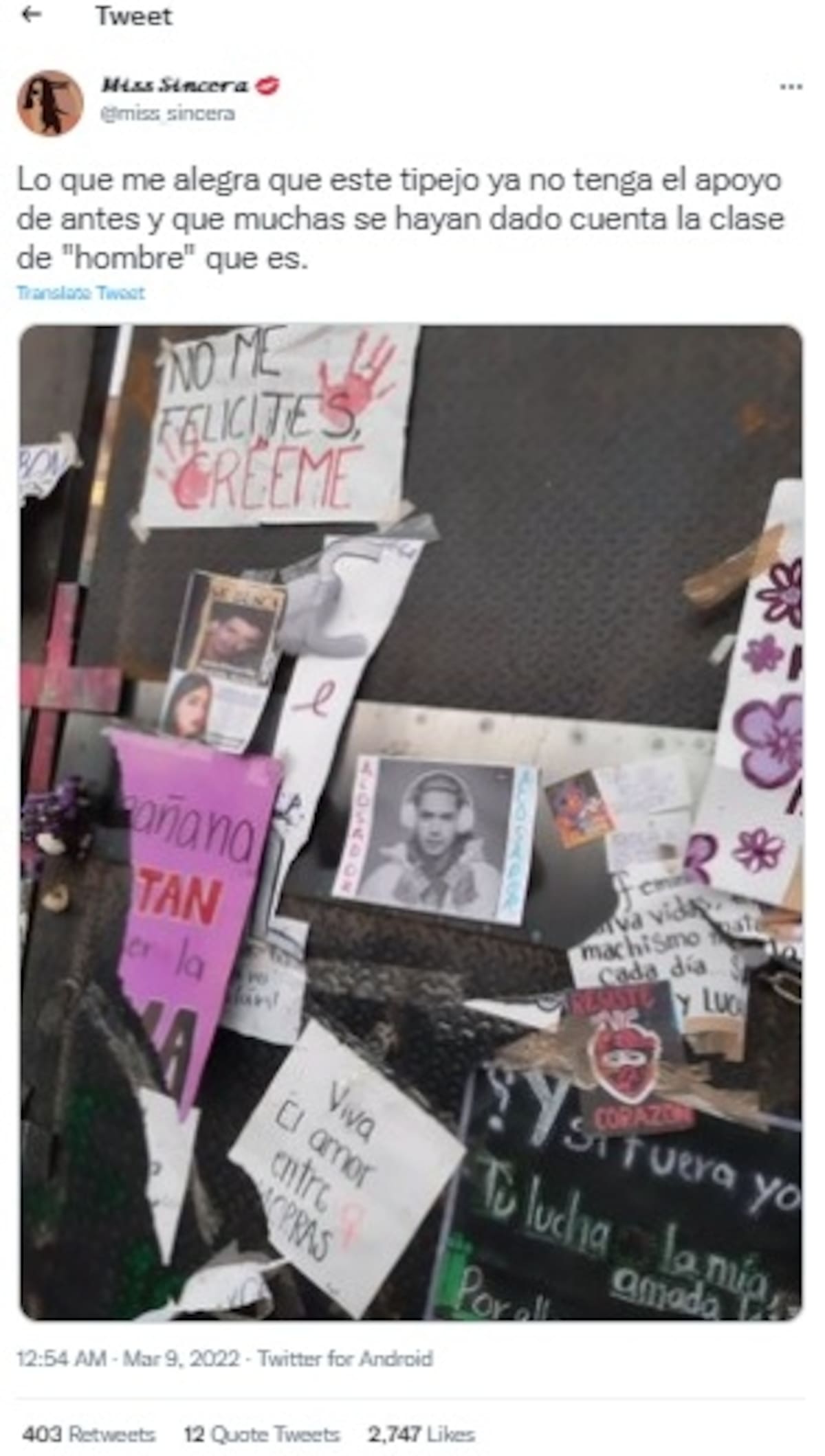 Fue así como el youtuber se convirtió en tendencia con el hashtag "#JuanPantojaAgresor", esto a partir de un post que se viralizó, en el que aparecen carteles del cantante con duras frase en medio de las manifestaciones del 8M en México.