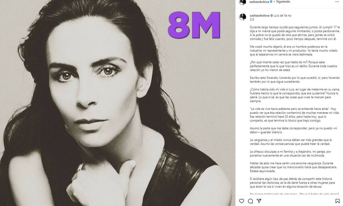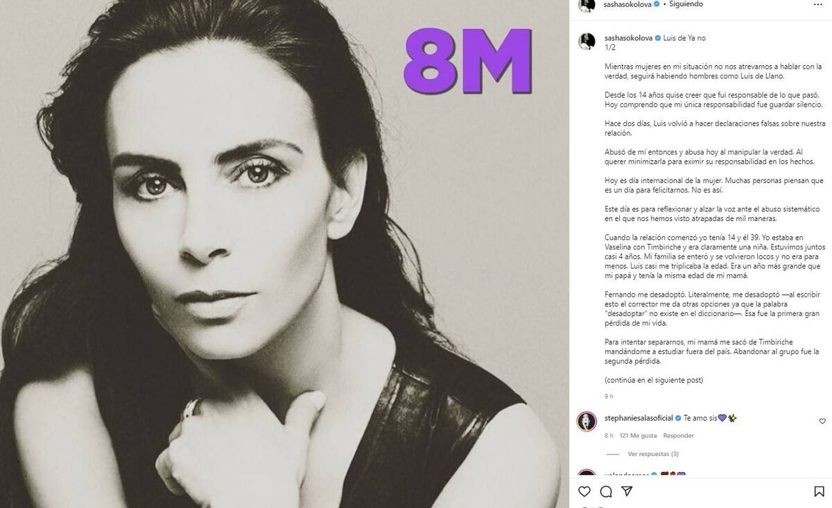 Luego de que el pasado fin de semana, el productor musical Luis de Llano hablara por primera vez de la relación que tuvo con Sasha Sokol, a pesar de que ella era menor de edad, la ex integrante de Timbiriche utilizó sus redes oficiales para contradecir su versión de los hechos.