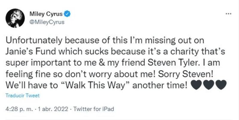 "Desafortunadamente, debido a esto, me estoy perdiendo el Fondo de Janie, que apesta porque es una organización benéfica que es muy importante para mí y mi amigo Steven Tyler. ¡Me siento bien, así que no te preocupes por mí! ¡Lo siento Steven! ¡Tendremos que "caminar por este camino" en otro momento", agregó en otra publicación.