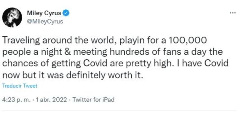 Miley Cyrus, luego de una exitosa gira por Colombia, Brasil, Chile y Argentina anunció a través de su cuenta de Twitter que dio positivo a covid-19.