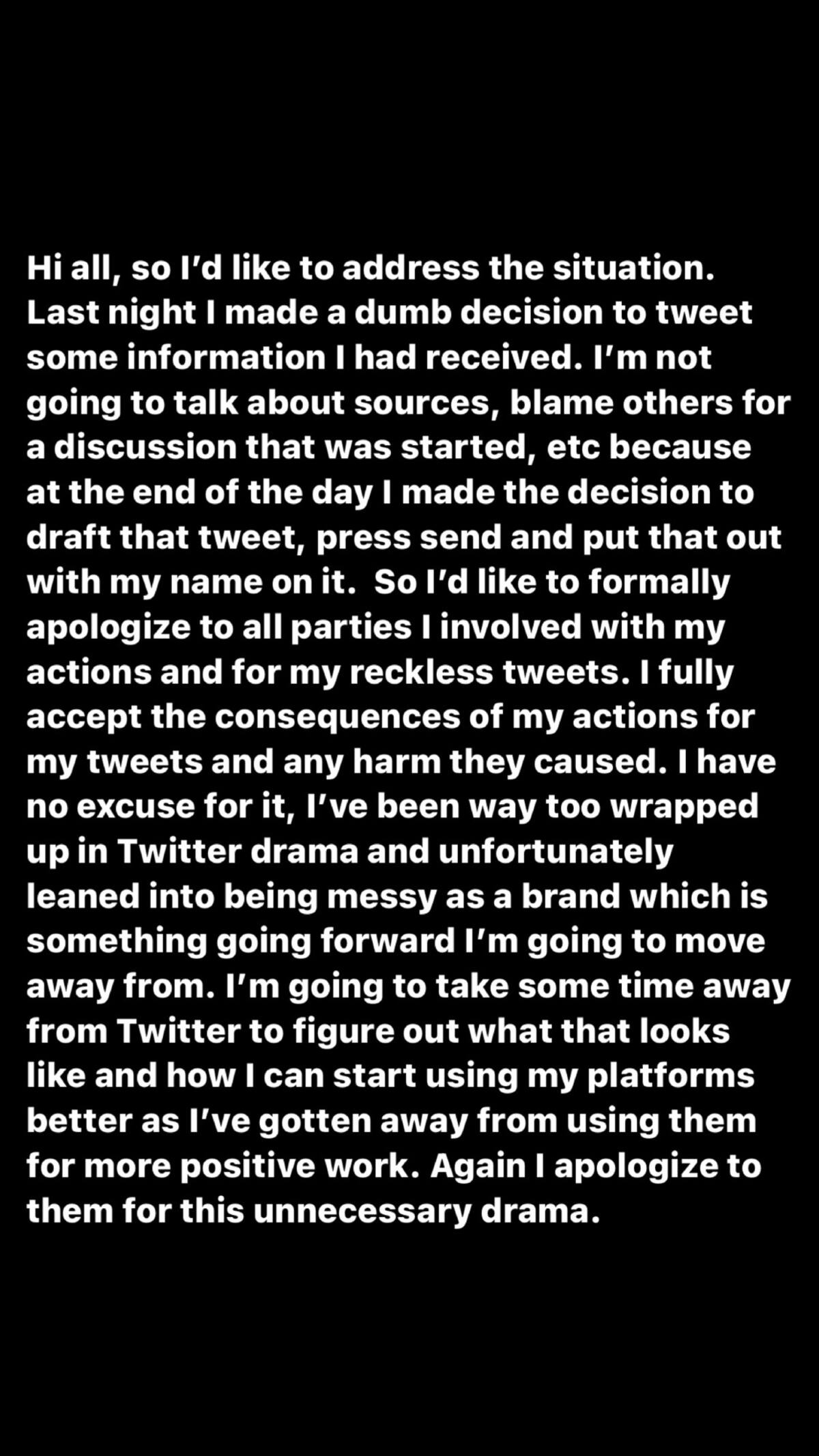 "Tomé la tonta decisión de twittear información que había recibido. No voy a hablar de fuentes, culpar a otros por una discusión que se inició, porque al final del día tomé la decisión de redactar ese tweet, presionar enviar y publicarlo con mi nombre".