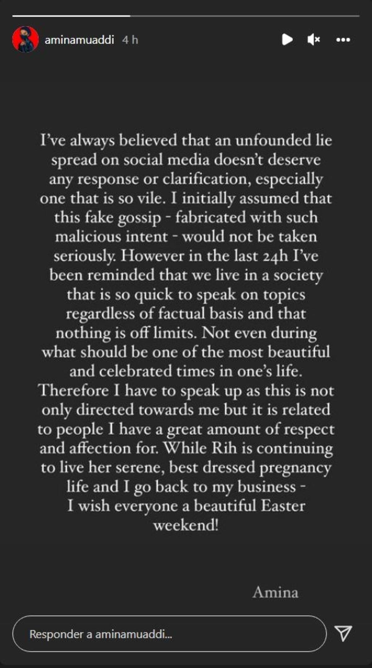"Tengo que hablar, ya que esto no solo está dirigido a mí, sino que está relacionado con personas por las que tengo un gran respeto y afecto. Mientras Rih continúa viviendo su vida de embarazo serena y mejor vestida y yo vuelvo a mi negocio - ¡Les deseo a todos un hermoso fin de semana de Pascua!", concluyó.