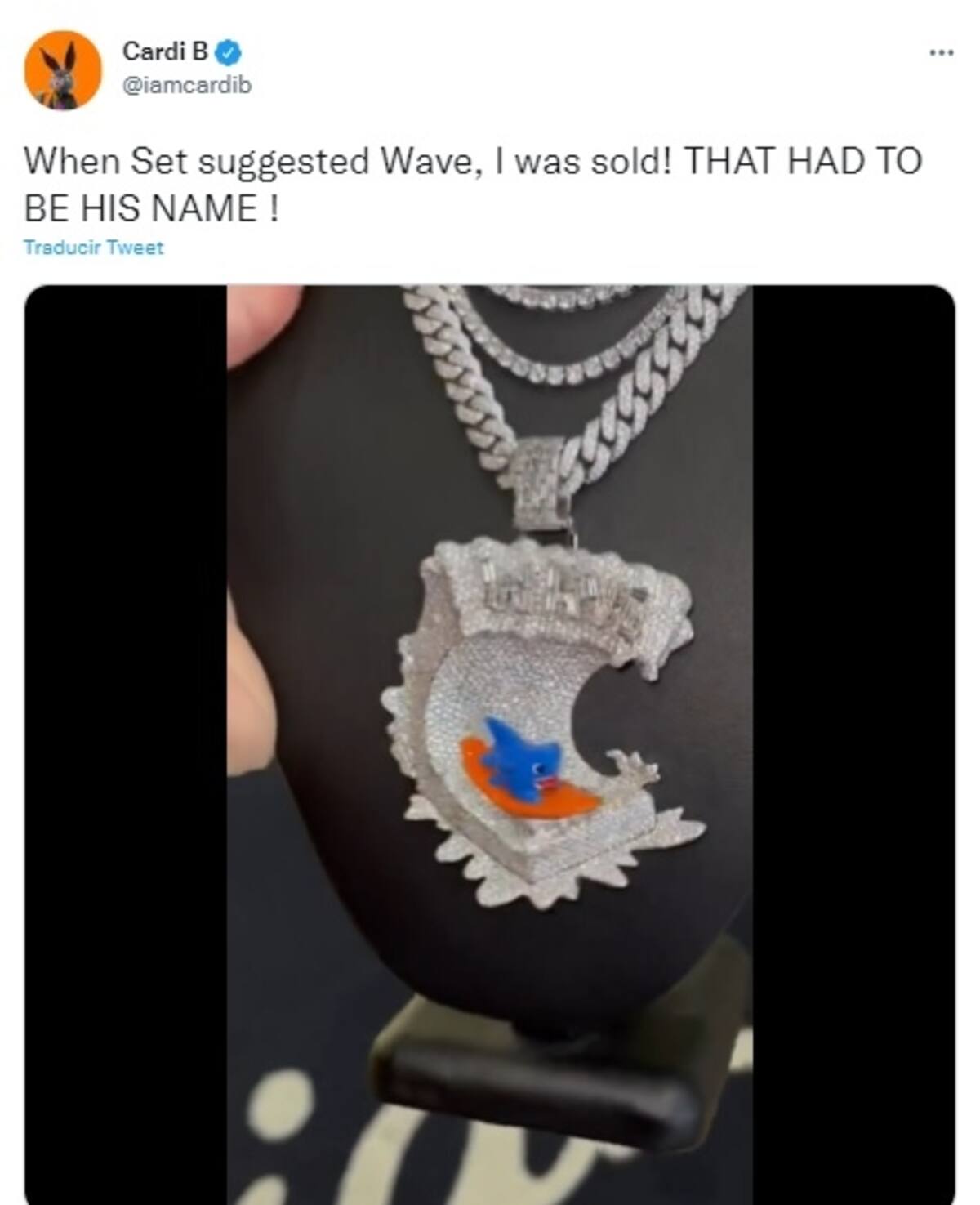 Fue este detalle la primera pista del nombre que Cardi B y Offset decidieron para su bebé. Fue en Twitter donde la cantante confirmó que el pequeño llevará por nombre Wave (Ola). "¡Cuando Set sugirió Wave, me convencí! ¡ESE DEBE SER SU NOMBRE!", escribió en la red social.