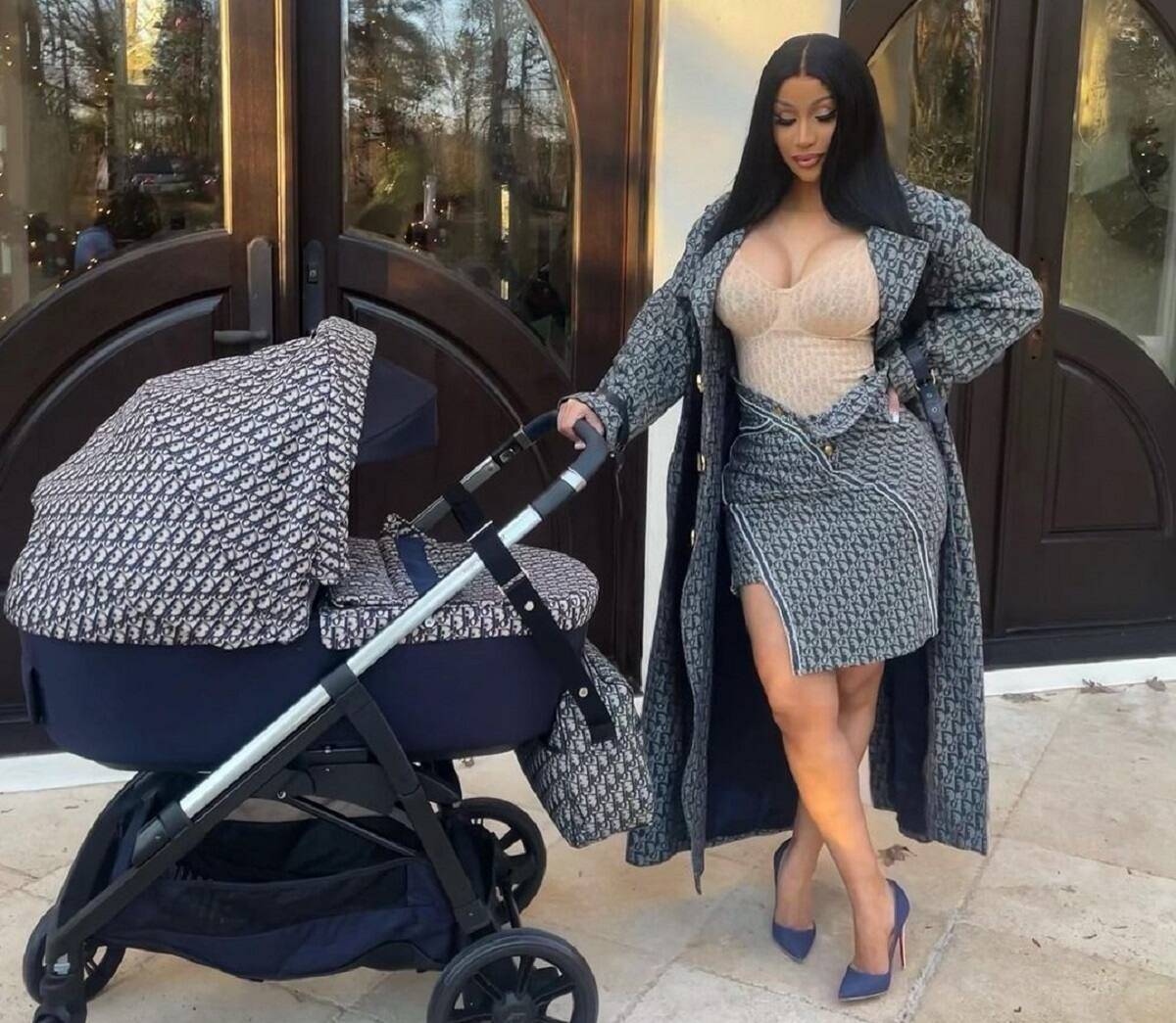 La rapera de 28 años compartió en su Instagram las imágenes con el siguiente mensaje: "????". En ella se puede ver al pequeño sentado en un moisés con mallas azules, una camiseta blanca, una camiseta azul y zapatillas blancas. Además lució un gorro blanco, una chaqueta azul. y un collar de diamantes con forma de ola.