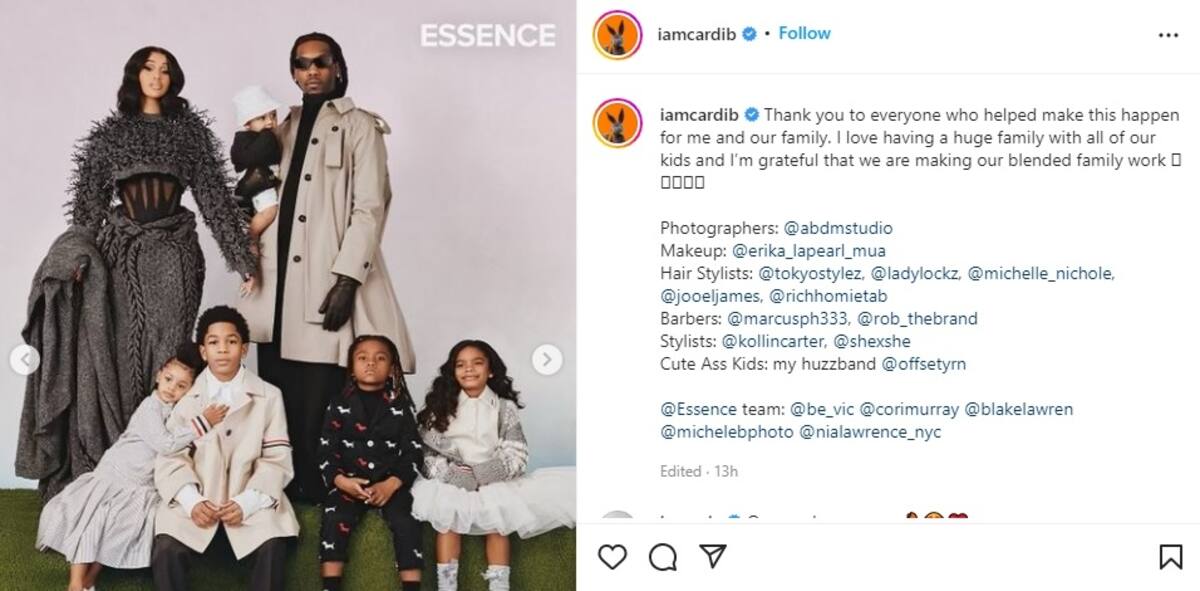 A su vez, tras mostrar por primera vez a su hijo, compartió una serie de imágenes que serán parte de la revista Essence para la que posaron en familia. La sesión de fotos incluyó a la hija de 3 años de Cardi y Offset, Kulture, junto con los otros tres hijos del rapero.