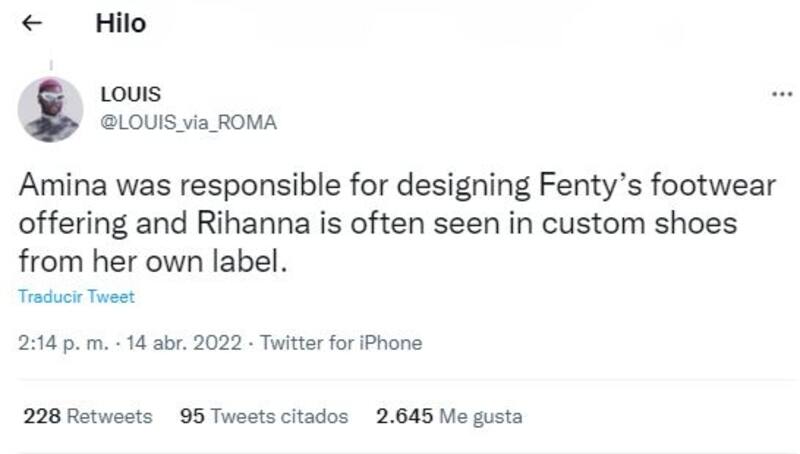 “Amina fue responsable del diseño del calzado de Fenty y Rihanna luce a menudo zapatos personalizados de esa marca“. “De hecho, Rihanna dejó de seguir a Amina en Instagram“, escribió.