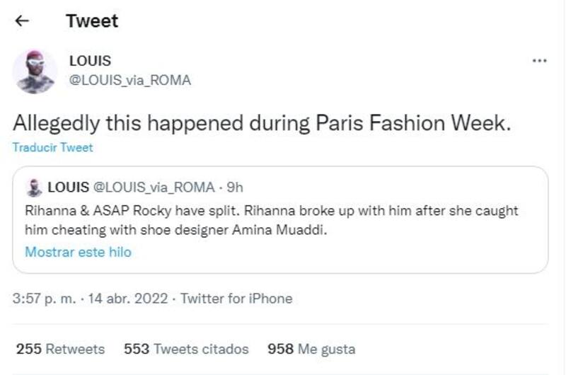 "Rihanna y ASAP Rocky se separaron. Rihanna rompió con él después de que lo descubrió engañándolo con la diseñadora de zapatos Amina Muaddi", escribió.