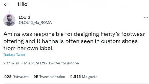 “Amina fue responsable del diseño del calzado de Fenty y Rihanna luce a menudo zapatos personalizados de esa marca“. “De hecho, Rihanna dejó de seguir a Amina en Instagram“, escribió.