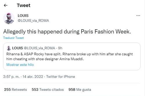 "Rihanna y ASAP Rocky se separaron. Rihanna rompió con él después de que lo descubrió engañándolo con la diseñadora de zapatos Amina Muaddi", escribió.