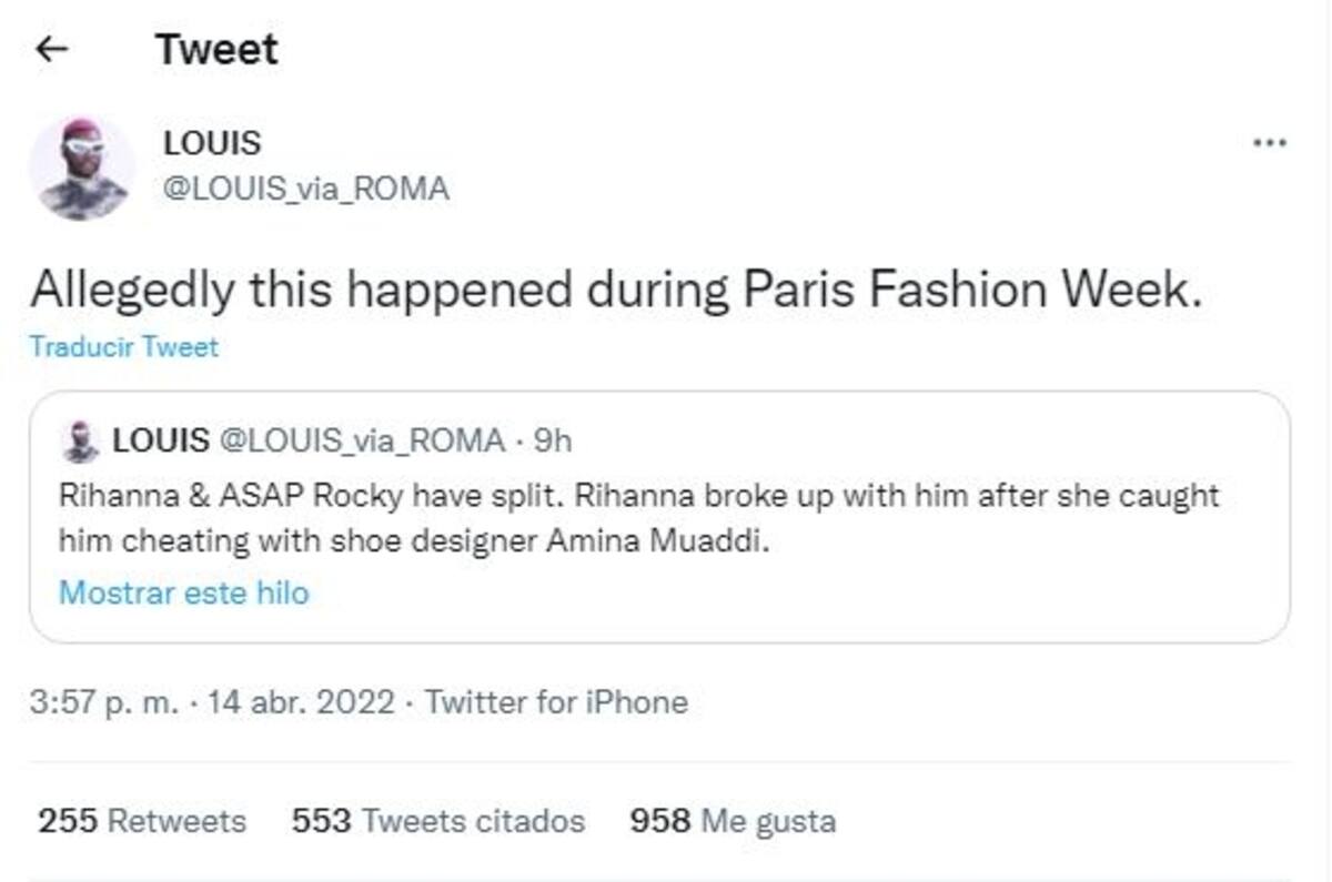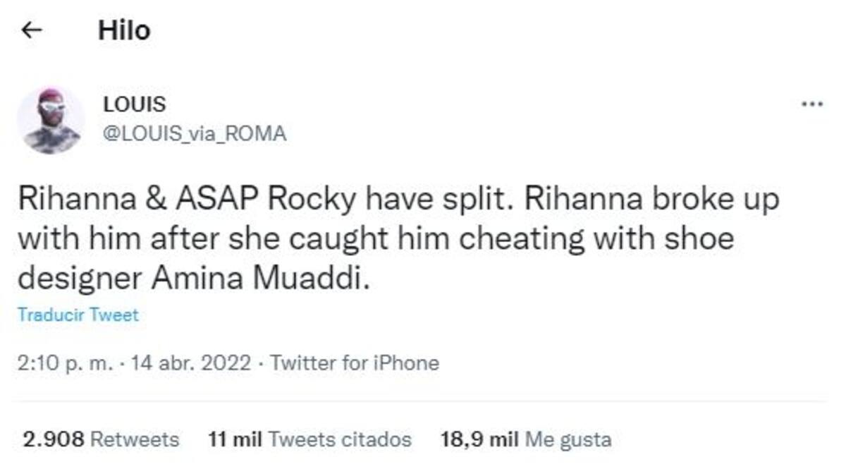 "Rihanna y ASAP Rocky se separaron. Rihanna rompió con él después de que lo descubrió engañándolo con la diseñadora de zapatos Amina Muaddi", escribió.