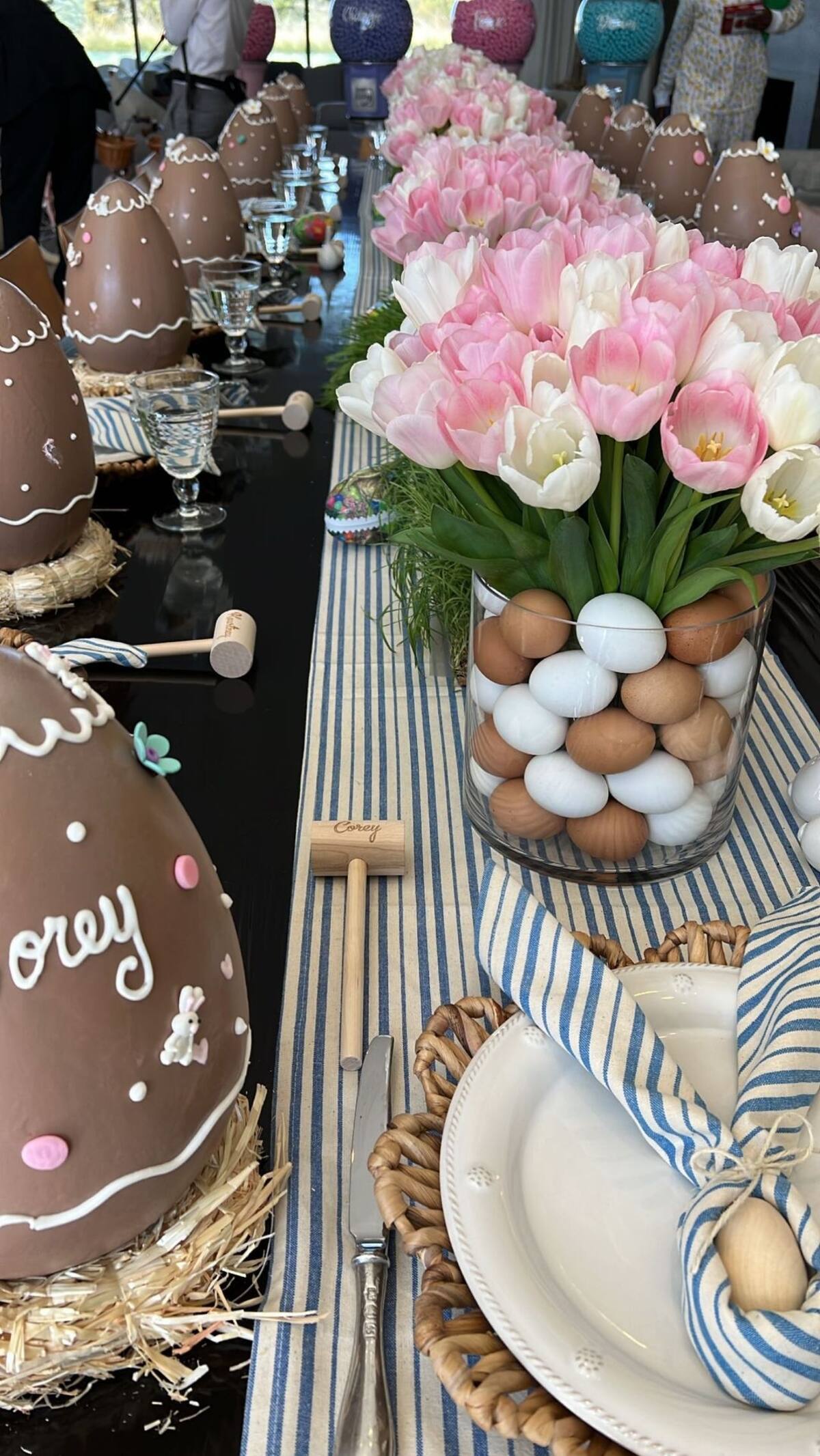 La mamá del clan Kardashian preparó un excéntrica mesa de dulces con flores, adornos y golosinas, pero lo que más llamó la atención fueron los huevos gigantes de chocolate personalizados con el nombre de cada uno de los integrantes de la familia.