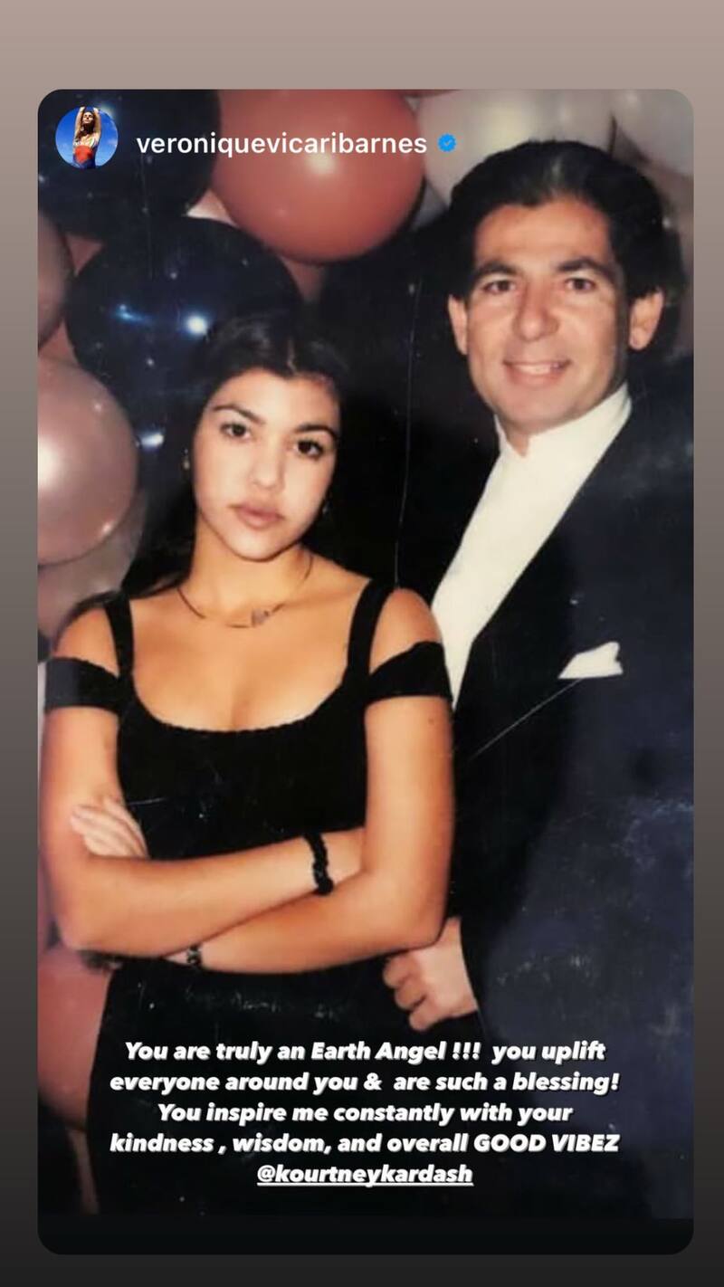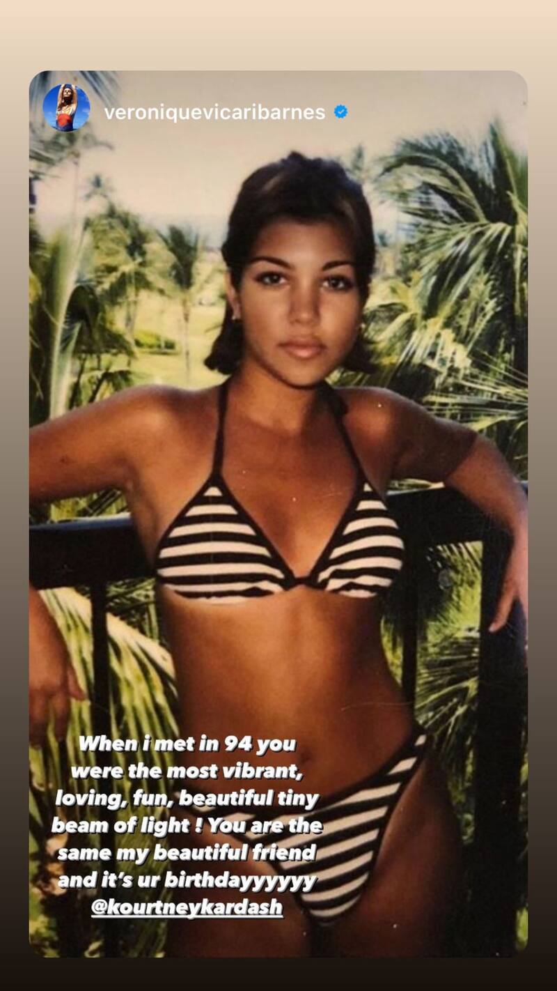 En una de las imágenes, en la que se ve a una jovencísima Kourtney recargada de un barandal en un bikini a rayas blancas y negras, Veronique escribió: "cuando te conocí en el 94 ¡eras el rayo de luz más vibrante, amado, divertido y hermoso! Sigues siéndolo mi hermosa amiga y hoy es tu cumpleañosssss".