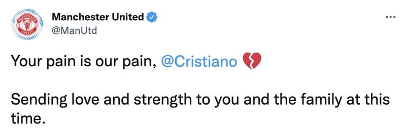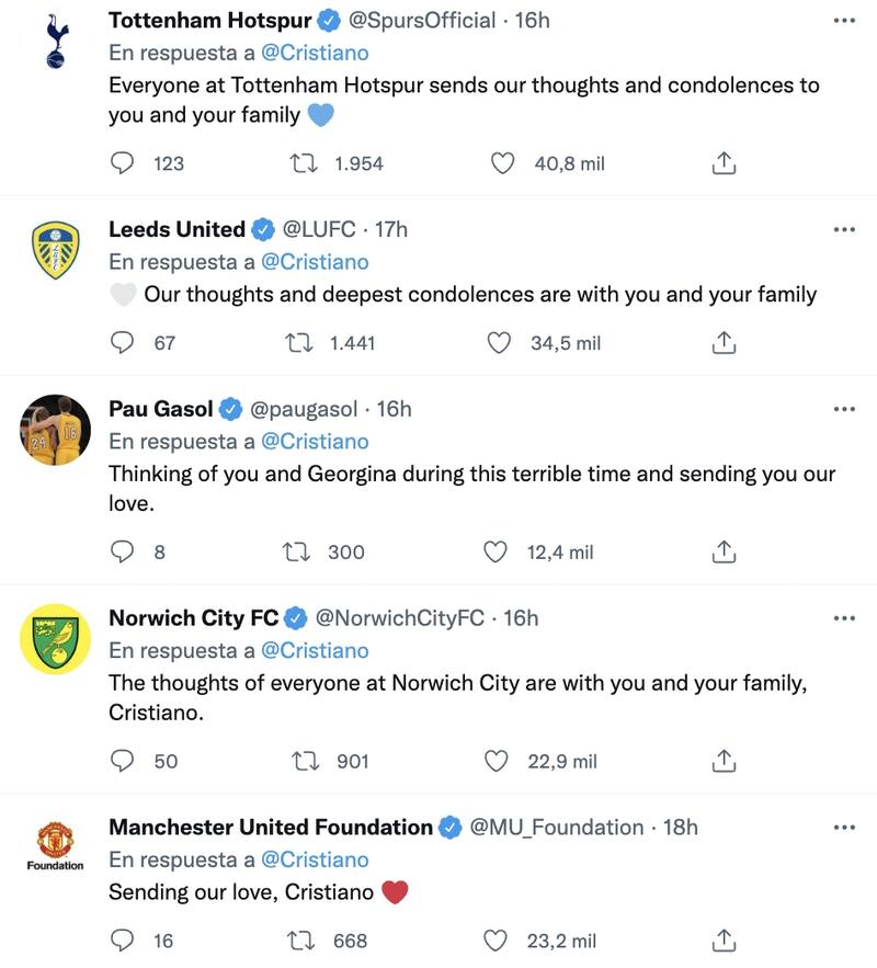 La comunicación oficial enviada por Cristiano Ronaldo en Twitter tiene más de 160 mil retweets y supera los 83 mil comentarios, entre los que se encuentran las cuentas oficiales del United en la que le escribieron al jugador: "Tu dolor es nuestro dolor. Mandamos amor y fuerza a la familia en estos tiempos difíciles".