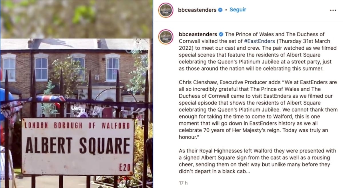 Según la cuenta oficial de la serie en Instagram, la visita del Príncipe de Gales y la Duquesa de Cornualles ocurrió el jueves 31 de marzo de 2022, donde conocieron al elenco y equipo. "La pareja vio mientras filmábamos escenas especiales que presentan a los residentes de Albert Square celebrando el Jubileo de Platino de la Reina en una fiesta callejera, tal como lo celebrarán en todo el país este verano", se lee en un comunicado en dicha red social.