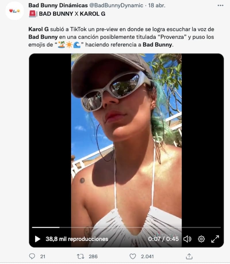 Sin más, debido a la estética de verano que remite a las vacaciones del fragmento del video compartido por Karol G, los usuarios han comenzado a crear una teoría: Karol G estaría anunciado un feat sorpresa con Bad Bunny.
