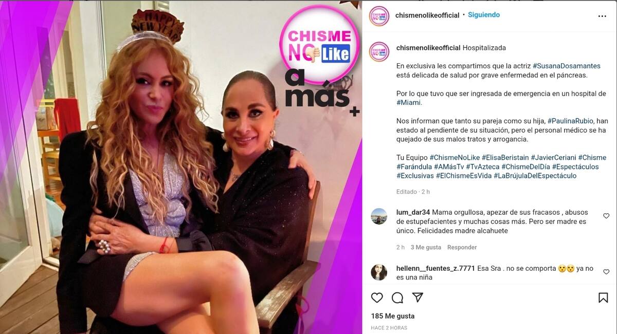 "La mamá de Paulina Rubio, Susana Dosamantes, está viviendo el momento más delicado de su vida porque lo que está padeciendo es de esas enfermedades que son graves: el páncreas. Es terrible a menos que Dios lo disponga y ocurra un milagro", informaron los conductores Elisa Beristain y Javier Ceriani.