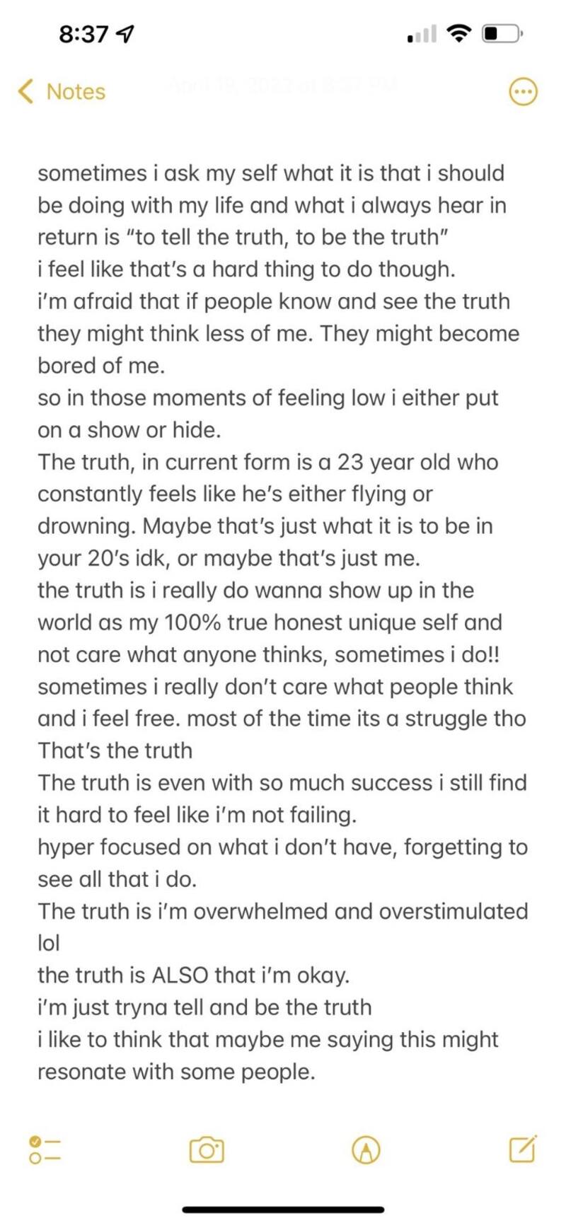 En su mensaje, el músico de 23 años reveló que en la actualidad vive altibajos: “la verdad, en la forma actual (Shawn) es un chico de 23 años que constantemente siente que está volando o ahogándose. Tal vez eso es lo que es estar en tus 20, no sé, o tal vez solo soy yo. La verdad es que realmente lo hago”.