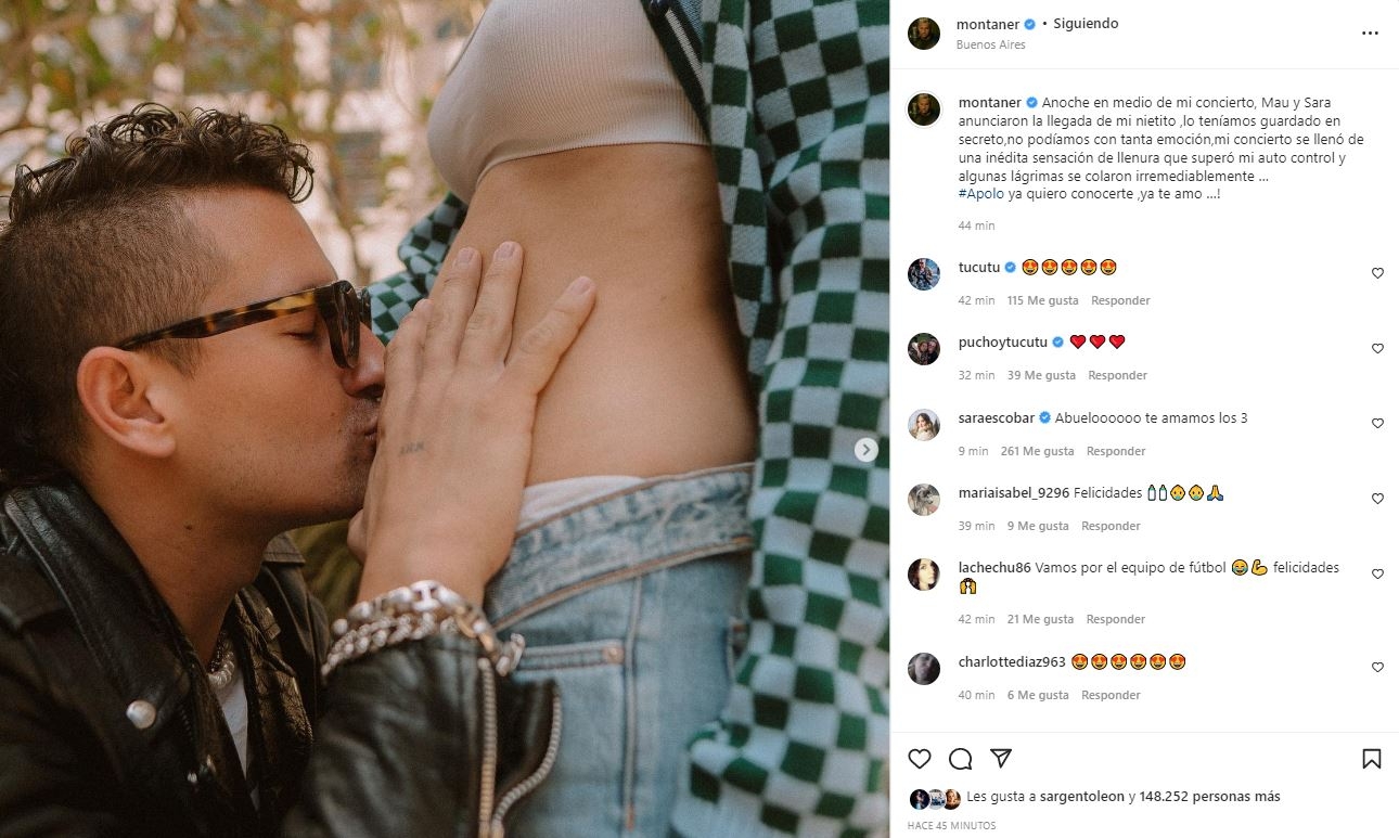 Como era de esperarse el orgulloso abuelo, Ricardo Montaner, reaccionó a la noticia con un sentido mensaje que acompañó con una postal de su hijo Mau besando la pancita de su bella esposa y una más de la pareja abrazándose.