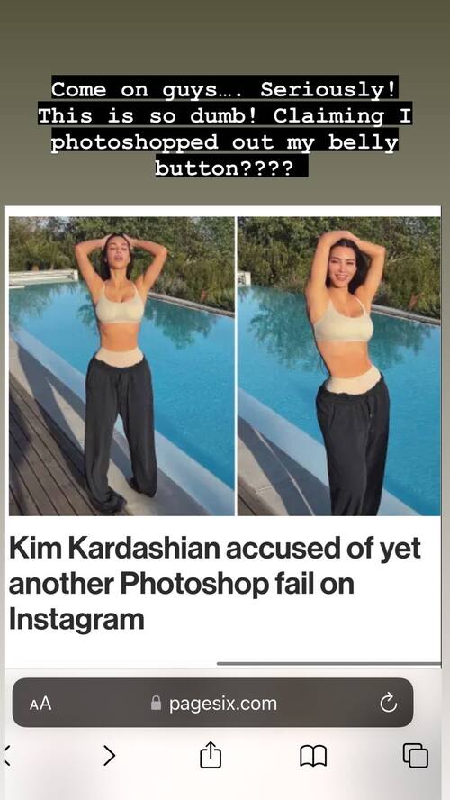 Reacciones que fueron recogidas por medios como Page Six y cuya llegó a los ojos de Kim Kardashian, quien no dejó pasar la oportunidad para cuestionar la acusación de editar su foto. "Vamos chicos... ¡En serio!", comenzó diciendo la celebridad. "¡Esto es tan tonto! Acusando que me saqué mi ombligo con Photoshop".