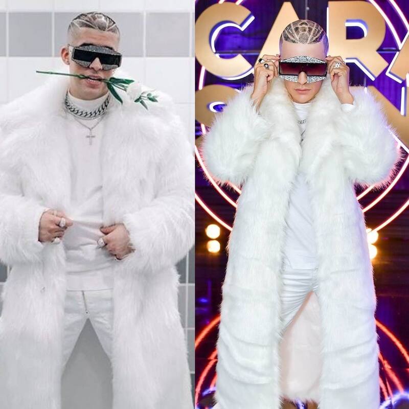 En su presentación, la actriz interpretó el tema "Chambea" de Bad Bunny y apareció con un look glamuroso total white, incluyendo un ostentoso abrigo de piel color blanco, incluso cadenas y los famosos lentes del puertorriqueño.