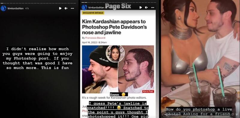 A través de Instagram Stories con capturas de pantalla, la socialité de 41 años primero negó haber retocado la nariz y barbilla de su novio, Pete Davidson, en las fotos que compartió en esta misma red social, tal y como se dijo en algunos medios de comunicación.