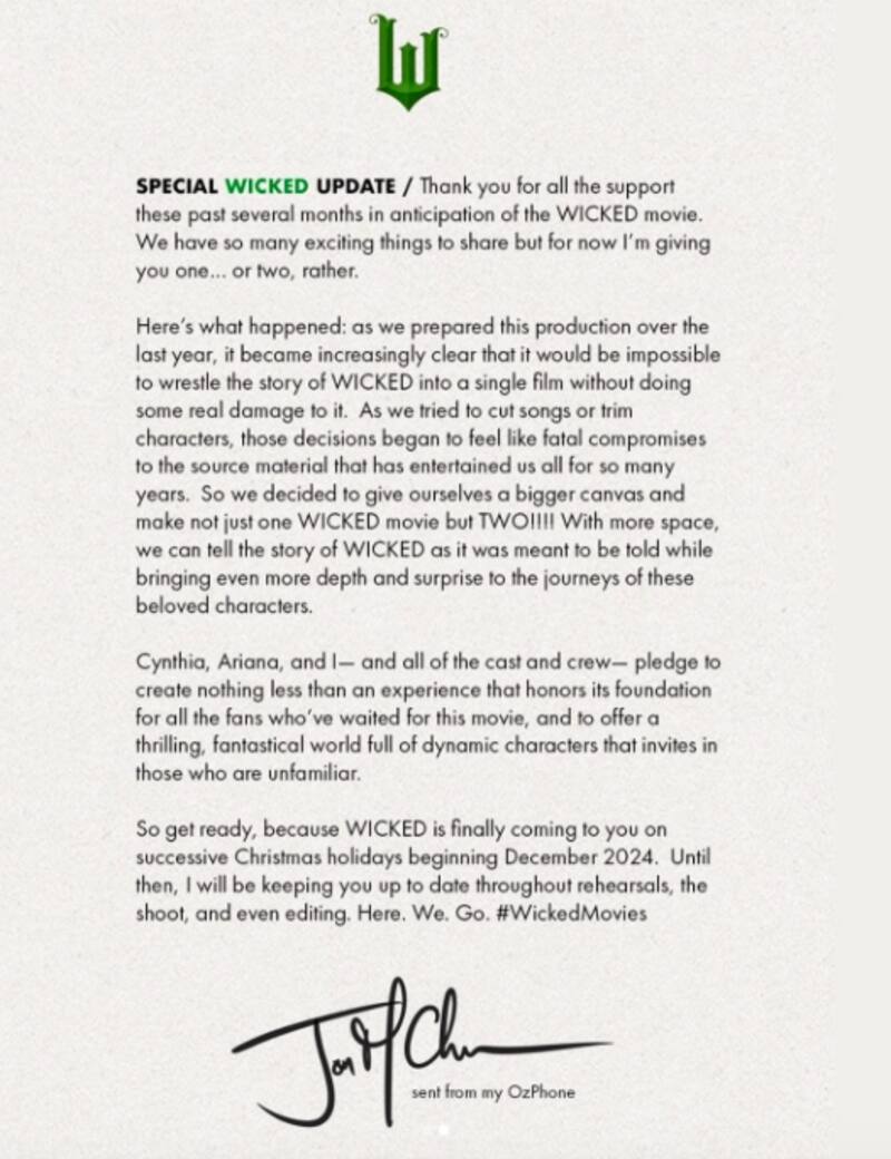 Lo dieron a conocer a través de un comunicado oficial: "Mientras estábamos preparando la producción el año pasado, nos dimos cuenta que era imposible contar la historia de Wicked en una sola película. Tratábamos de acortar canciones y ajustar personajes pero esas decisiones nos empezaron a parecer fatales para el material original que nos ha entretenido durante años, así que hemos decidido darnos un lienzo más grande y no hacer solo una película de Wicked, sino dos. Con más espacio podemos contar la historia como se debería contar dándole más profundidad y sorpresas con estos queridos personajes", se lee.