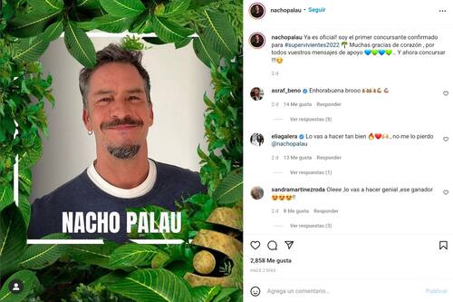 En medio de la batalla legal que libra por la custodia de los cuatro hijos que comparte con Miguel Bosé, el artista Nacho Palau participará en el "reality show" "Supervivientes". La noticia fue dada a conocer por la cadena que emite este concurso, Telecinco, y después fue confirmada por Palau en sus redes sociales.