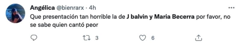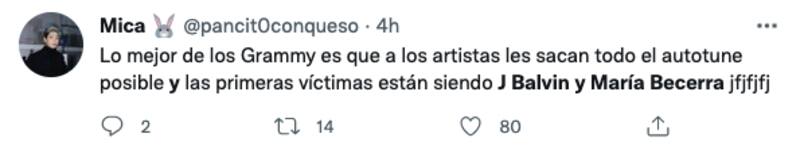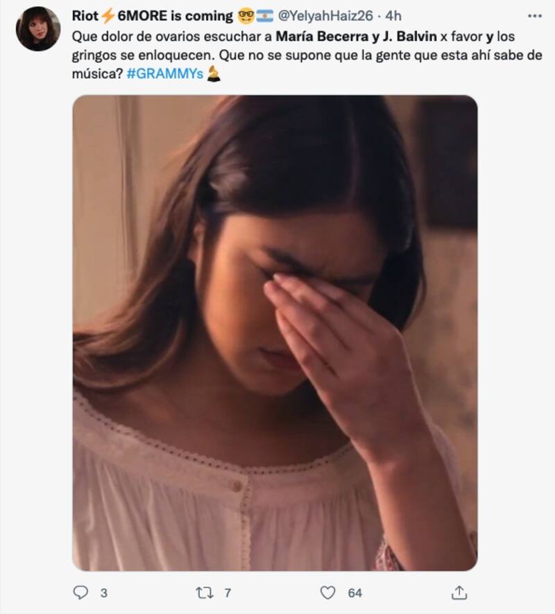 Luego de la presentación de J Balvin y María Becerra en la 64 edición de los Grammy, se abrió la conversación al respecto en Twitter con algunos tweets que pusieron en duda el talento de la argentina e incluso criticaron su forma de cantar.