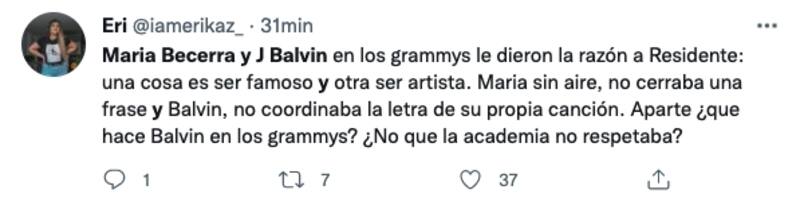Sin embargo, a pesar de que J Balvin y María Becerra fueron la perfecta representación de Latinoamérica en los Grammy (al igual que Mon Laferte que interpretó su canción "La Mujer" en el escenario), no encantó a todos.