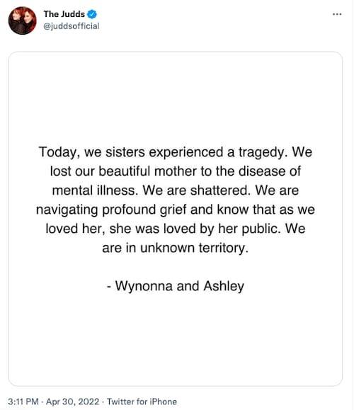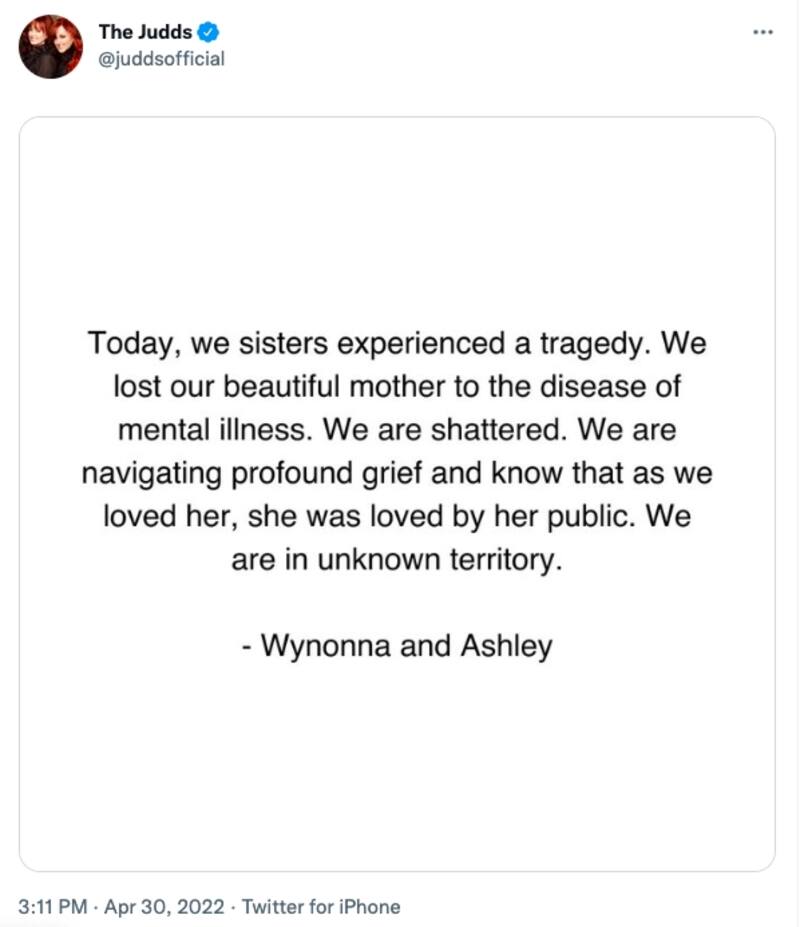 No se han dado a conocer más detalles, aunque se conocía que desde niña había padecido depresión. Además, Naomi había dicho que sus problemas llevaron a la separación del dueto que tenía con su hija y al alejamiento entre ambas. No obstante, ya se habían reconciliado y tenían programada una gira, llamada The Final Tour, que empezaría en septiembre.