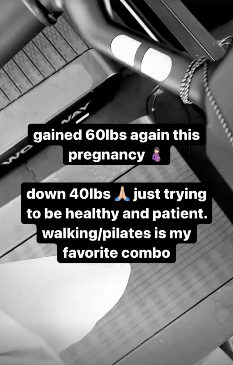 Fue a través de sus historias que aseguró que durante el embarazo subió 30 kilos y que no se ha presionado para perderlos, sino que más bien, se tomará su tiempo y ya ha perdido 20.